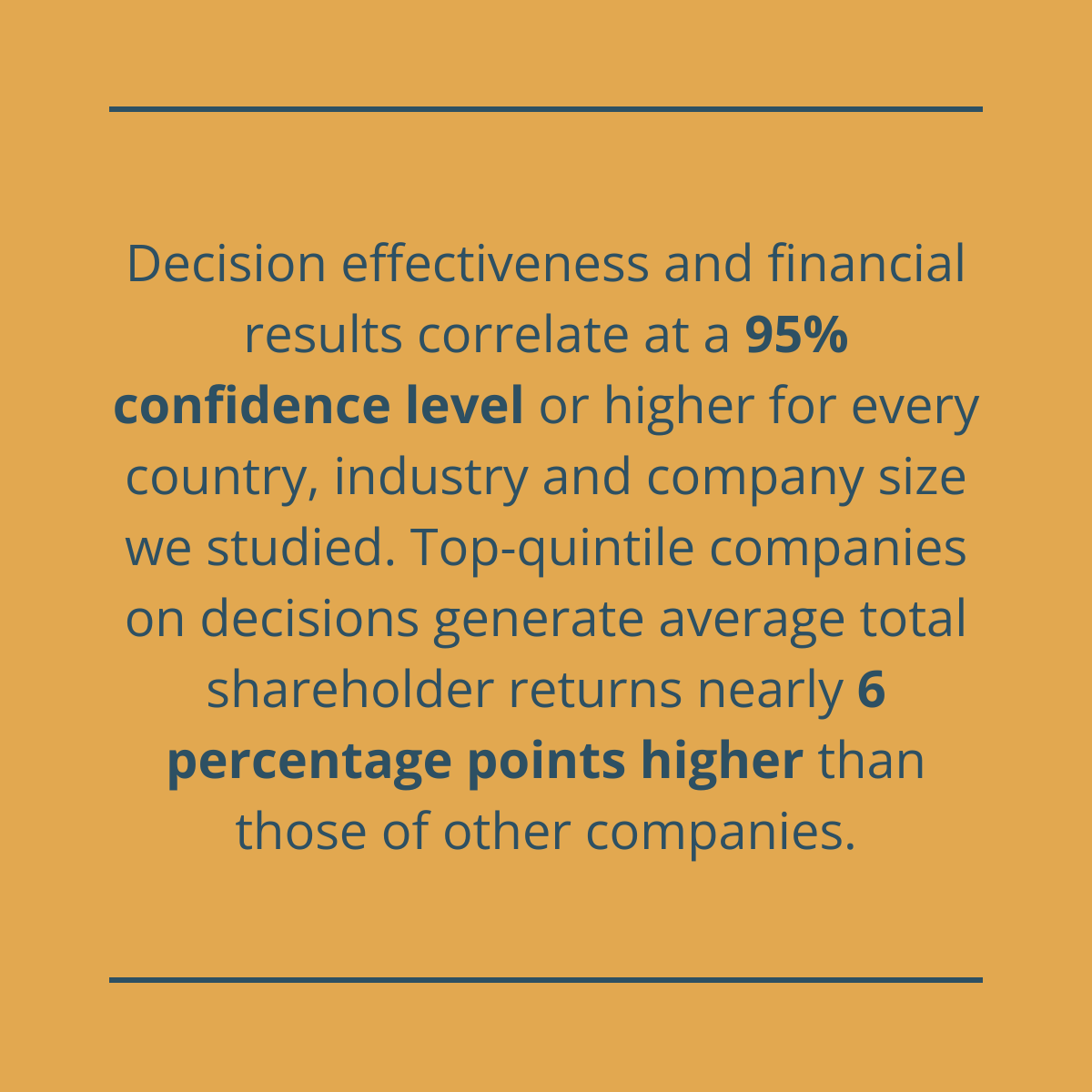 The quality of your decision-making significantly impacts whether your business succeeds or fails. Research by Bain and Co. found a direct correlation between decision effectiveness and financial results, with a confidence level of 95%.